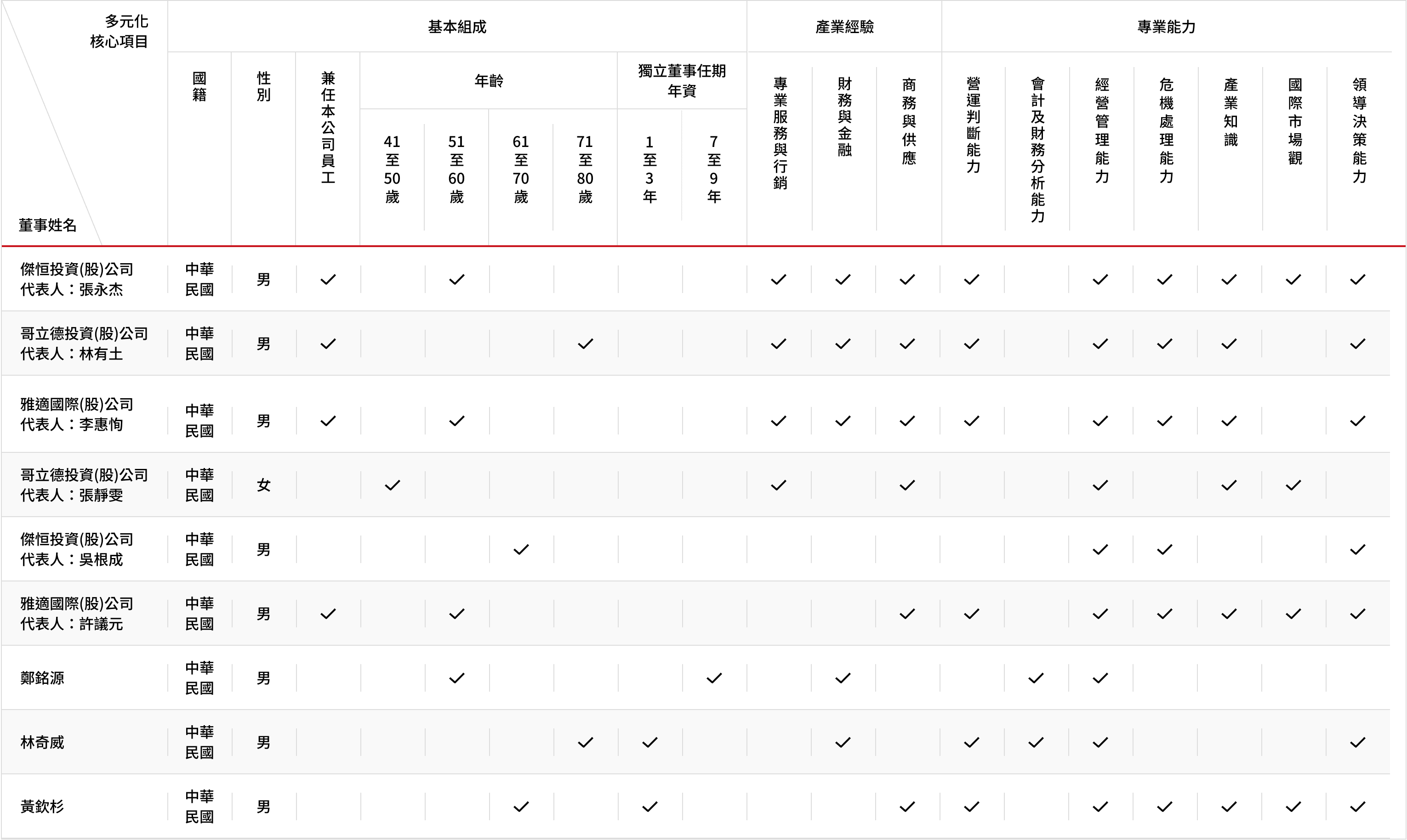本公司現任董事會 9 名董事成員(含 3 名獨立董事),整體具備營運判斷、領導決策、經營管理、國際市場觀、危機處理等能力,且有產業經驗和專業能力;其中善長於專業服務與行銷者為張永杰董事長、林有土董事、李惠恂董事及張靜雯董事。獨立董事擁有財務會計、金融及公司治理等專長;鄭銘源獨立董事擔任審計委員會召集人亦為本公司薪酬委員會召集人,曾任樹德科技大學金融保險學系講師,現任逢甲大學會計學系助理教授,專長於財務會計、薪酬績效管理、公司治理及金融保險,具備高度專業與經營實務,對公司財務規劃及未來發展提出精闢見解與建議。林奇威獨立董事亦為本公司薪酬委員會成員,為會計師國家考試及格領有證書之專門職業人員,曾任安永聯合會計師事務所合夥會計師,於審計專業領域工作經驗逾25年,具會計及財務分析專業能力,對薪酬績效管理、企業成長及相關投資具備豐富專業知識。黃欽杉獨立董事,為友益企業管理顧問有限公司董事長兼首席顧問,具策略規劃、經營管理、營運優化、產業分析、風險管理等專長,能提升董事會對公司營運管理之監督。